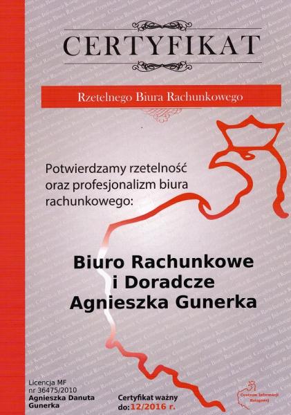 Certyfikaty Zachęcam do zapoznania się z certyfikatami, jakie otrzymało Biuro rachunkowe i doradcze Agnieszki Gunerki. Uzyskane certyfikaty stanowią potwierdzenie kwalifikacji, rzetelności i wiarygodności firmy.